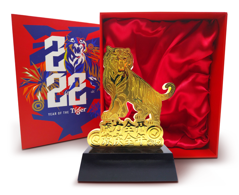 DTC World Singapore Team produced this customized CNY ornament for TIGER beer in 2021, each packaged in an elegantly gift box printed in exclusive TIGER branding. The gold ornaments were gifted as trade gifts to TIGER beer trade partners, wishing them prosperity and an auspicious year ahead!
