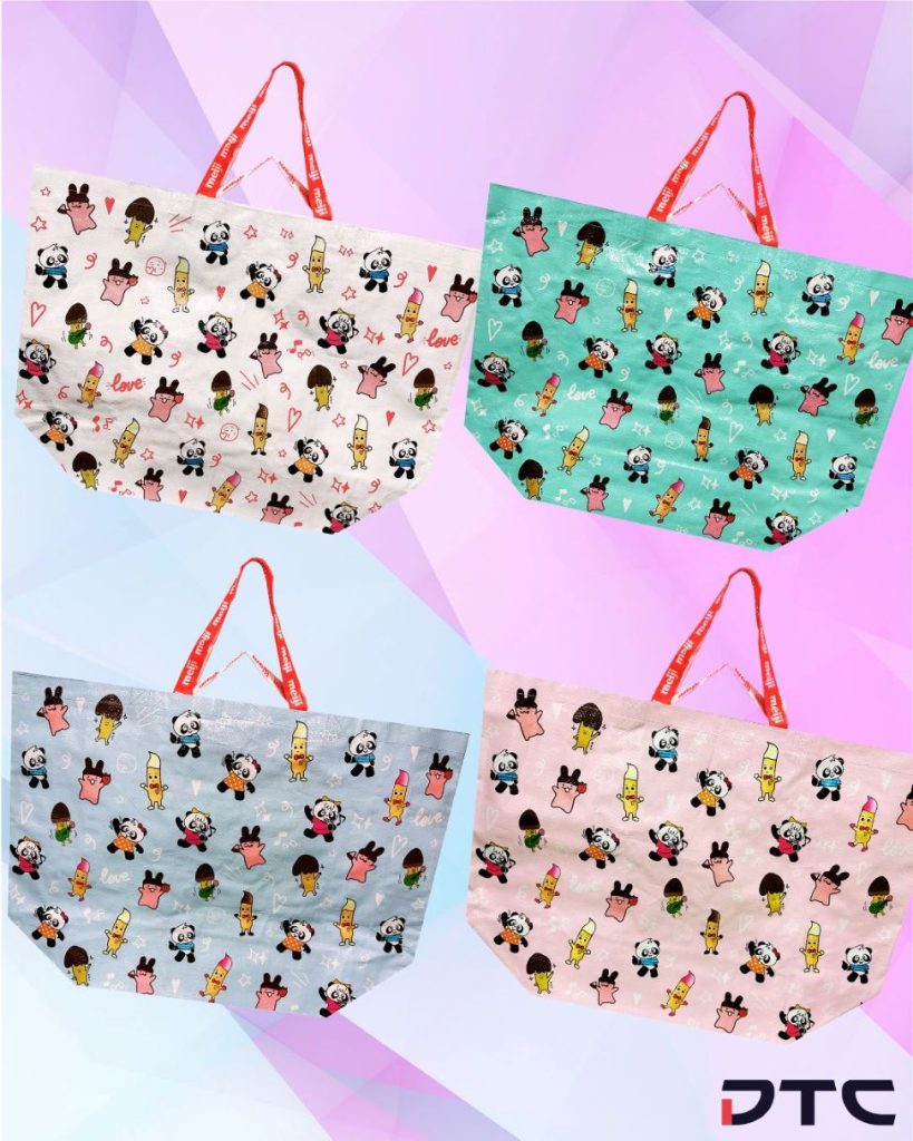 Large-sized, colourful, and reusable shopping bags featuring playful, eye-catching designs that reflect Meiji’s confectionery brand identity.