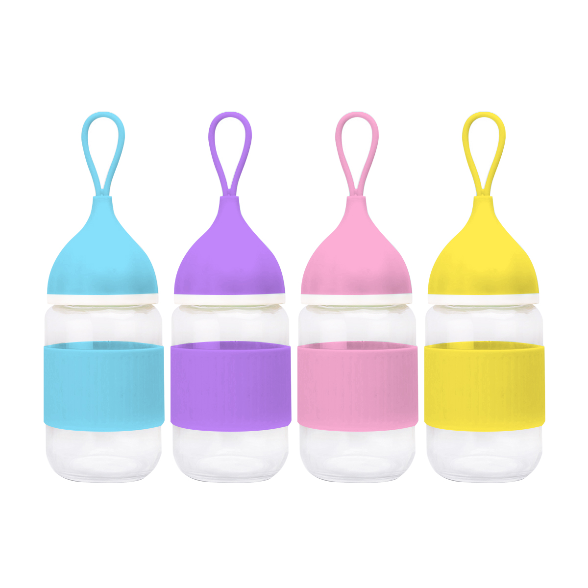 glass bottle that comes in a matching colour lid and  silicone grip that prevents slip and fall