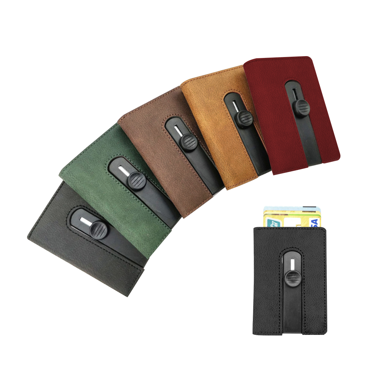 PU leather card case with RFID blocking function to keep cards organized & cards info secure. Access to cards with a single push-up button. Handy pocket-size that easily fits your pocket.