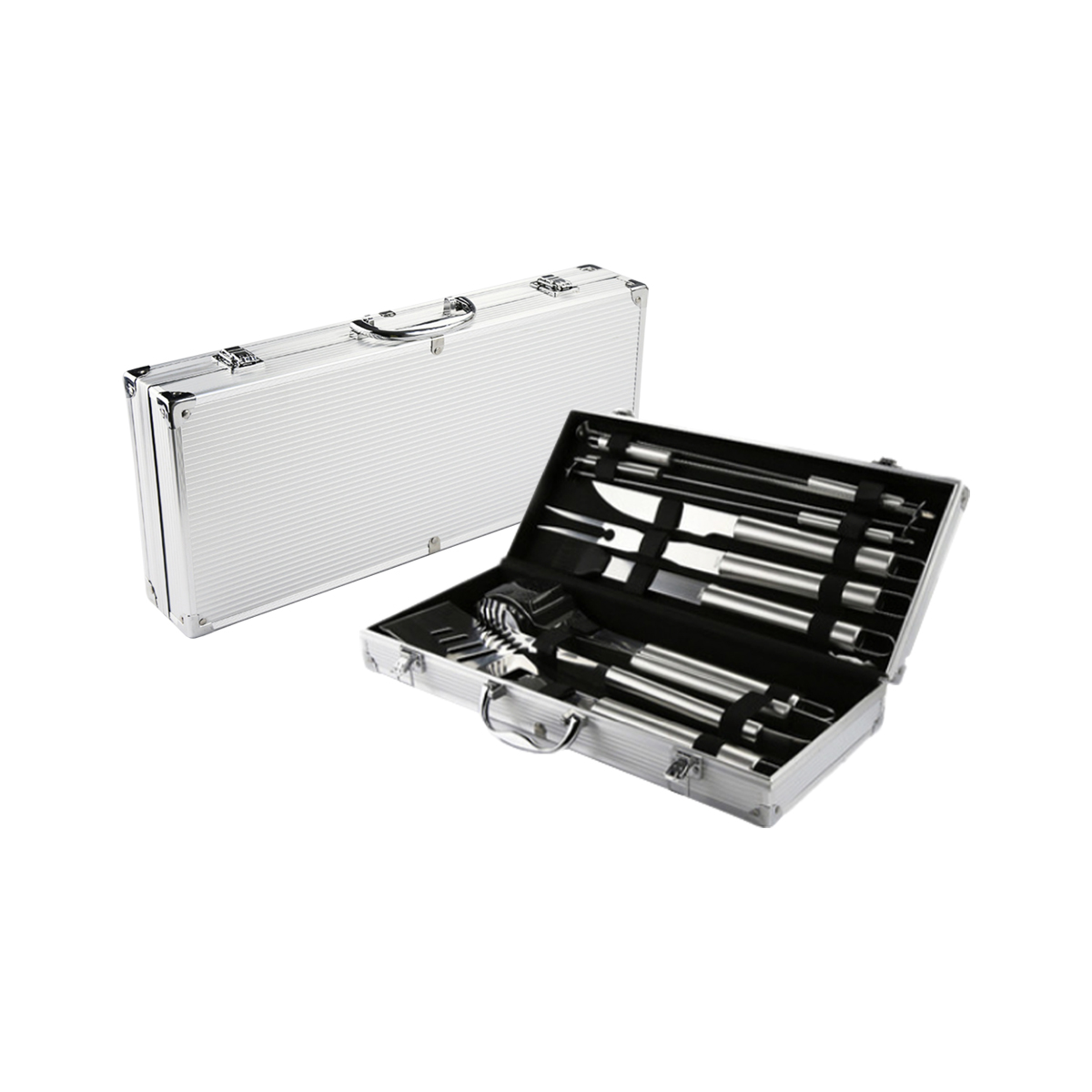 Comprehensive barbeque / grill tool set in portable stainless steel carry case. Consists of spatula, fork, thong, knife, brushes & skewers.