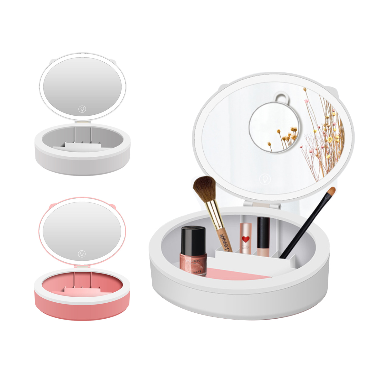 Tabletop makeup / cosmetic mirror with LED light. Touch the mirror to turn on the light. Come with a storage box for essential cosmetics. Good for use during traveling or staycation.