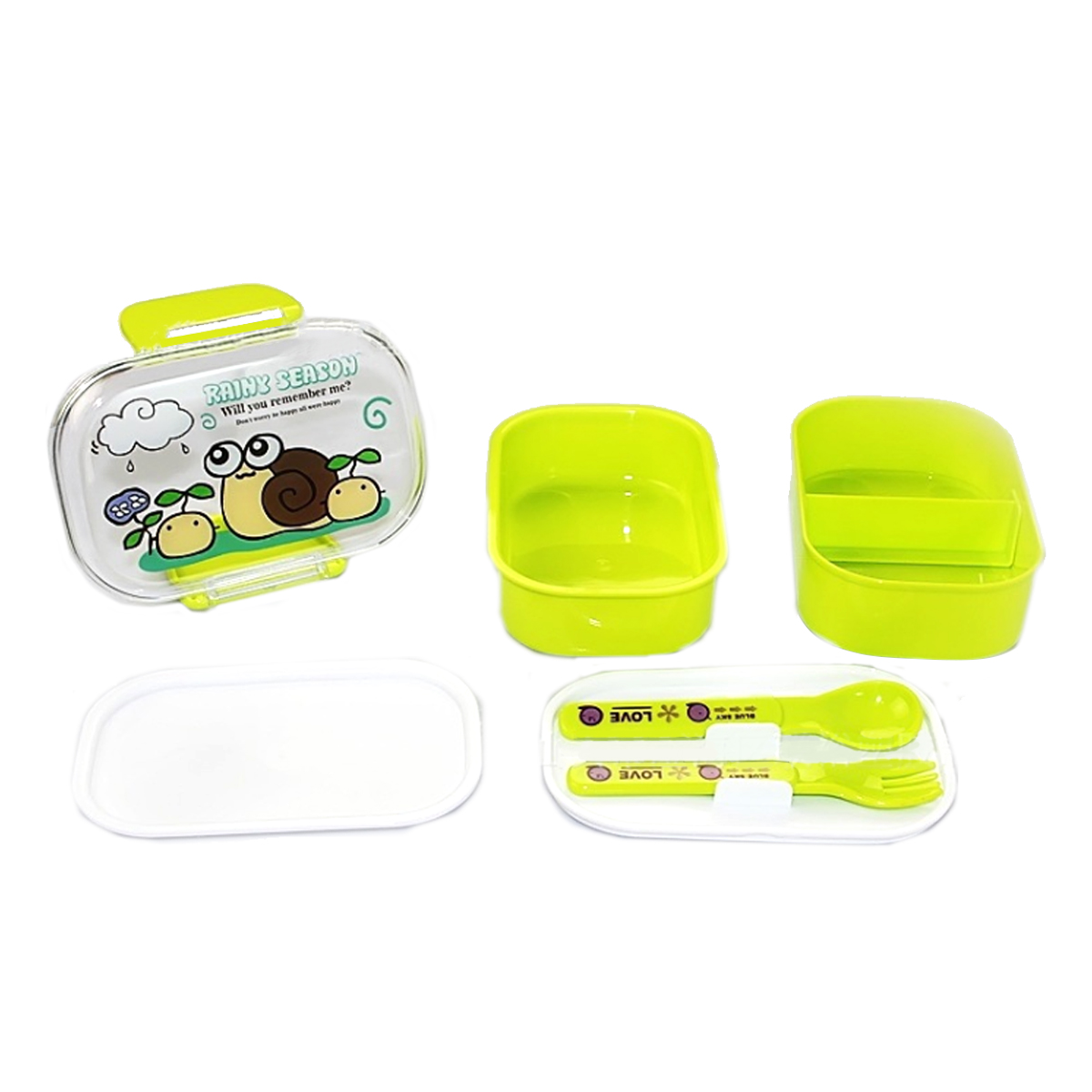 Crafted with food grade safe plastic material. 2-tier design, allowing you to pack different kinds of food for your lunch just in one container. Come with basic utensils & cute designs for kids.