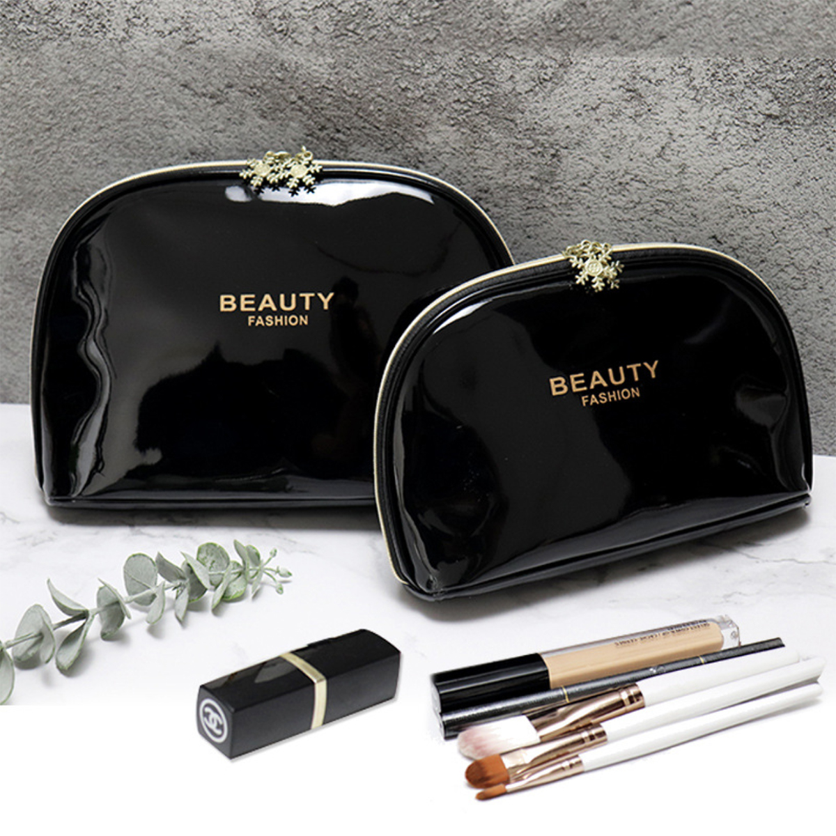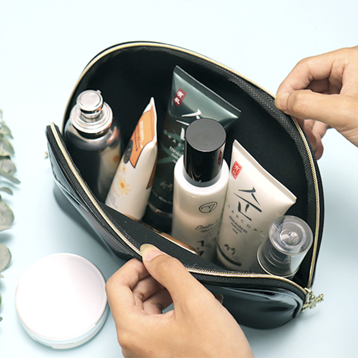 Handy glossy patent leather cosmetic pouch lined with stylish gold zipper. Can fit into handbags conveniently. Suitable for daily use or for travelling.