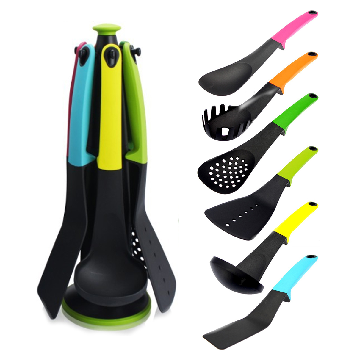 6pcs kitchenware tool set with 360 degrees rotating hanger stand. 100% safe, heat resistant, non-toxic and odourless. The material has a temperature tolerance range from -50°C-250°C. Suitable for cooking use.