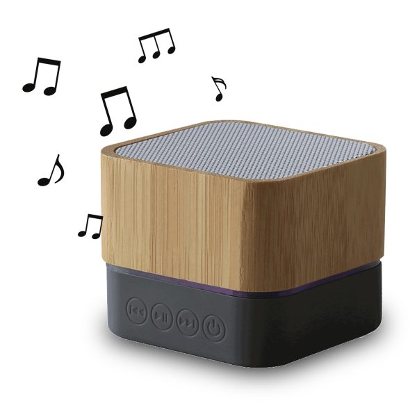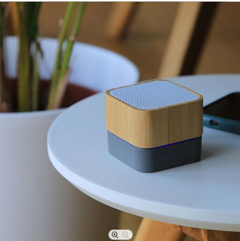 Bamboo Bluetooth speaker with LED light indication and a rechargeable Lithium 300mAh battery. Output data: 3W, 5 Ohm and 5V. Playing time approx. 3-4H.