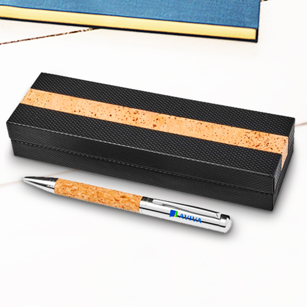 A Luxe premium promotional pen branded with your logo. This pen, with its barrel made of cork, has a modern, eco-aesthetic appeal. The pen comes branded with your logo, which can be printed or engraved to the cork barrel or metal top.