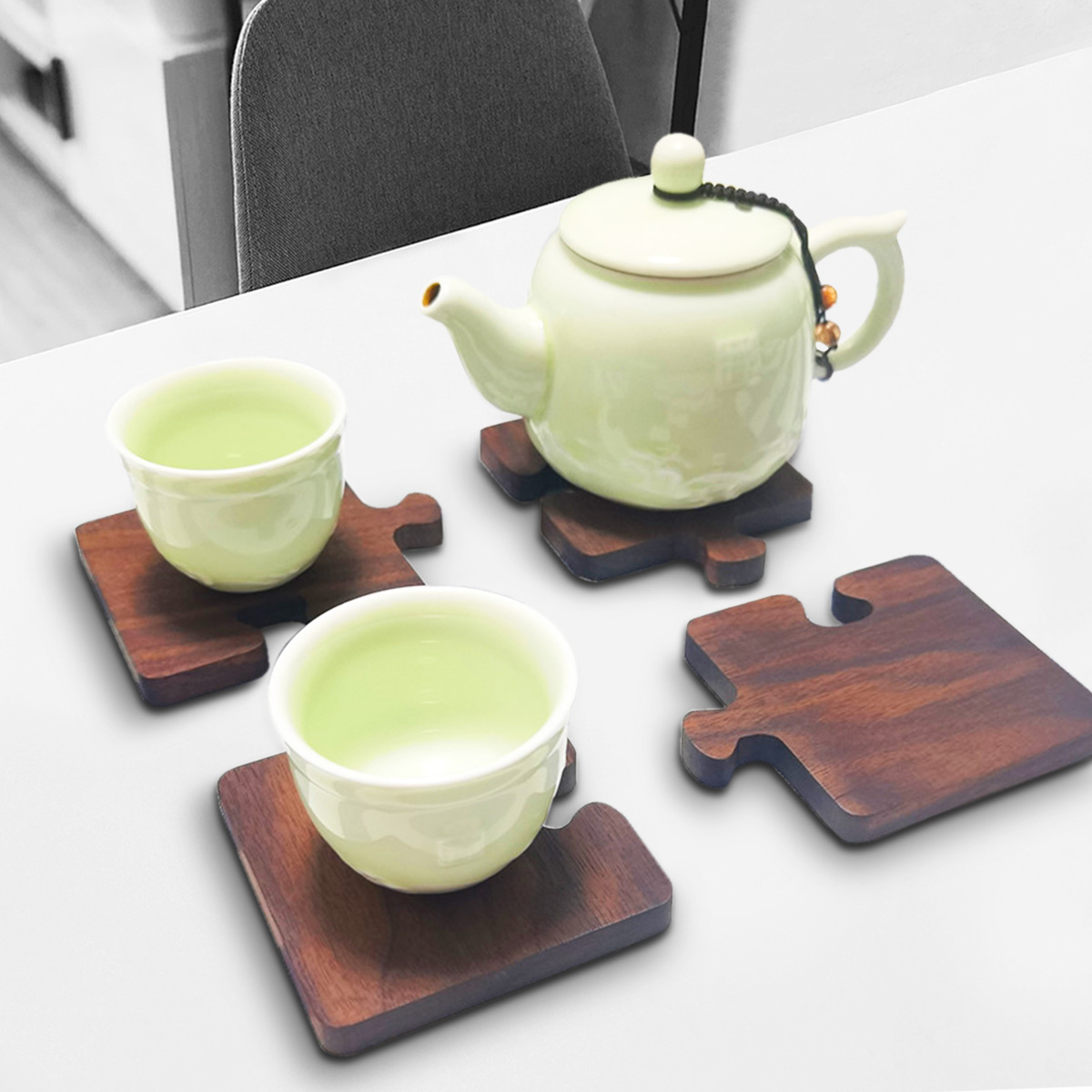 Coasters are shaped like puzzle pieces and made from wood. Include laser engraved imprint on all 4 coasters.
