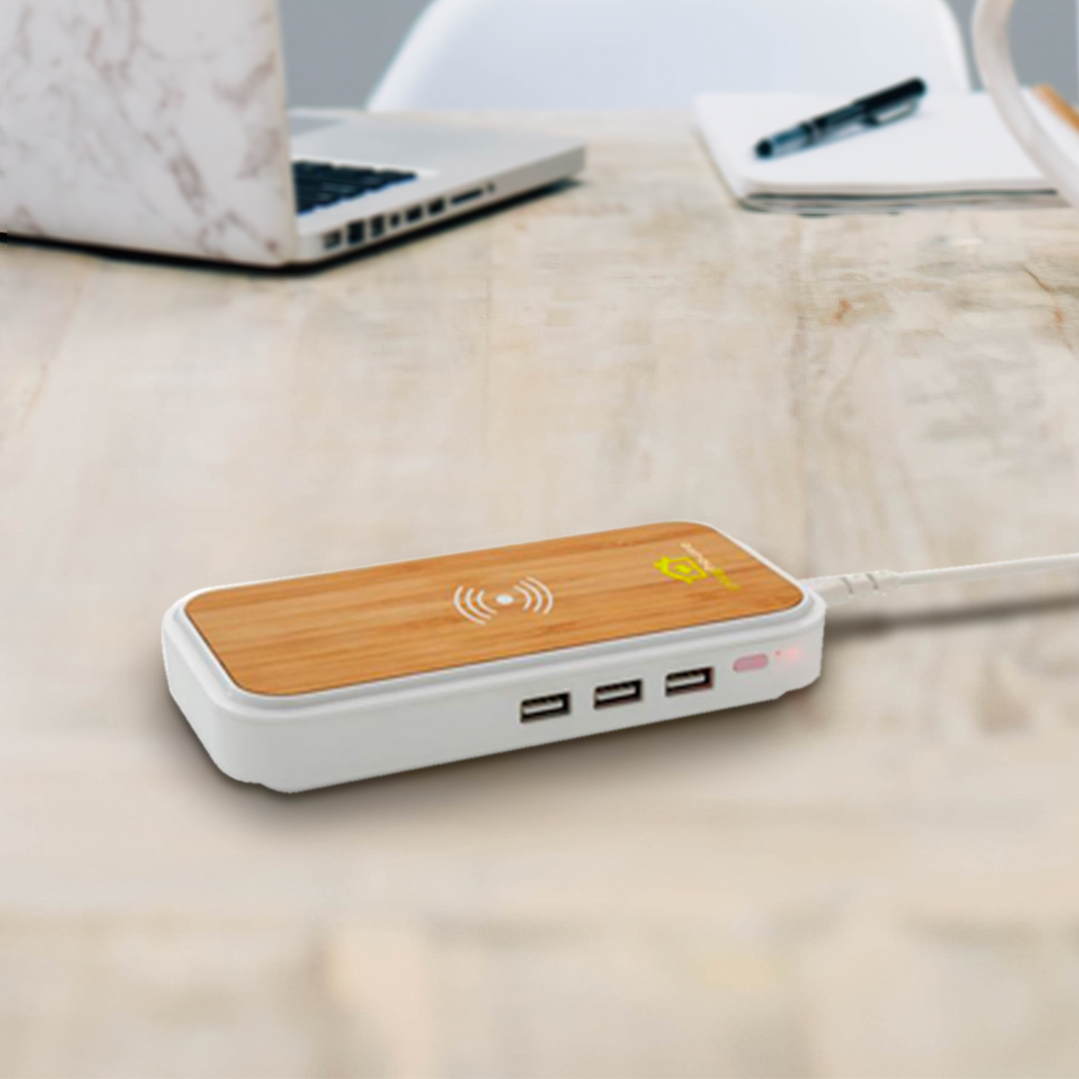 Eco power station with both 5W integrated wireless charger and 3 powerful USB ports made out of natural and durable bamboo.