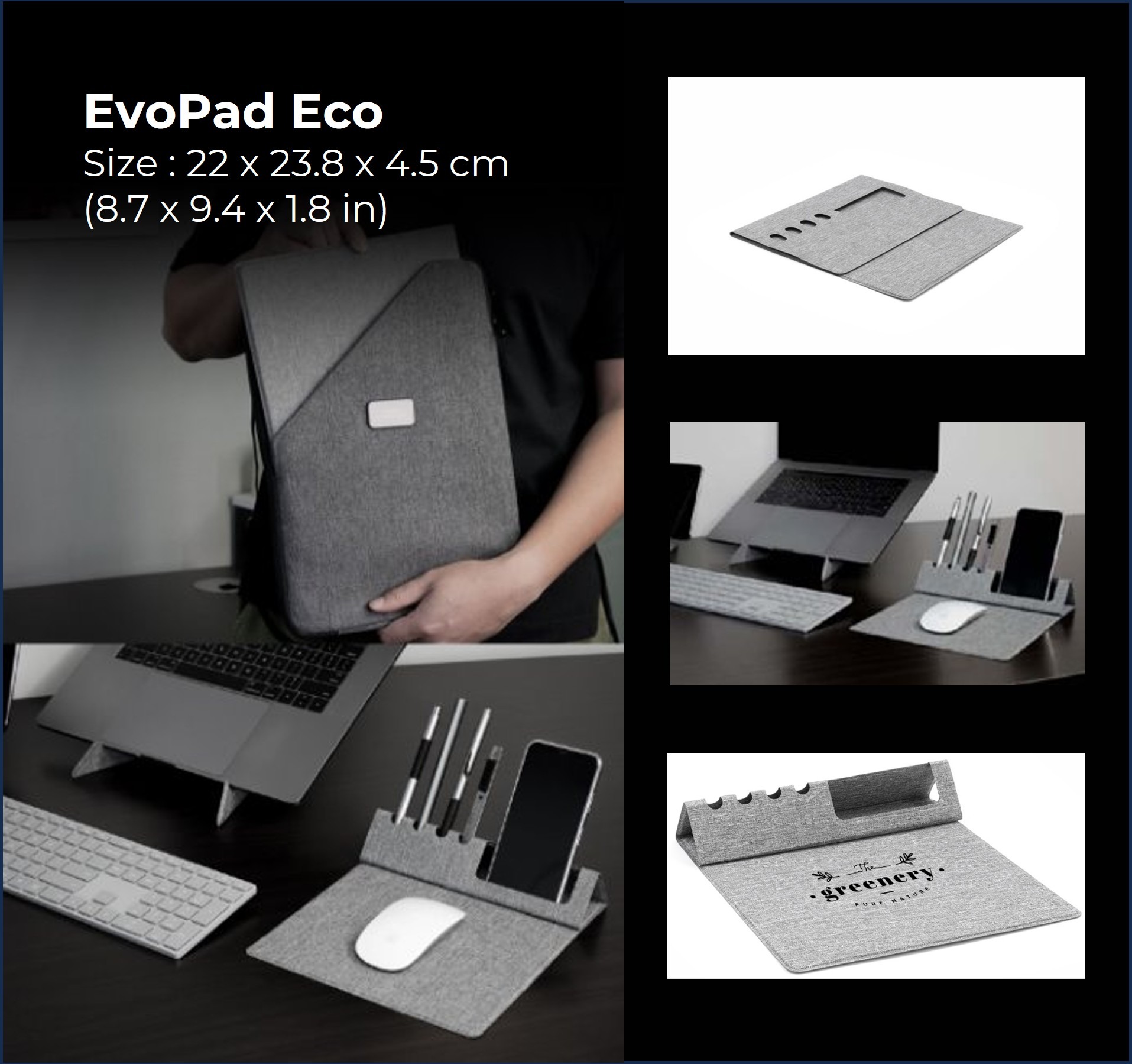 EvoPad Eco is a smart desktop organizer and mouse pad designed to enhance any workspace with sustainable style. Made from eco-friendly RPET, it stands out for its functionality and environmental value. Customizable logo placement, and packaging make it perfect for branding. Ideal as a corporate or event gift.